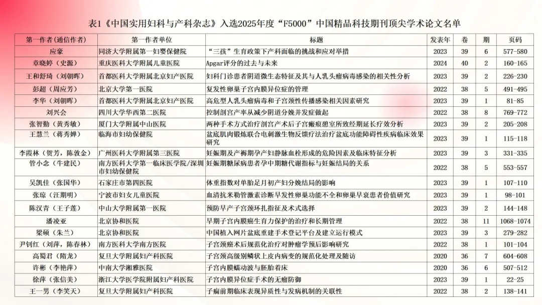 近日,国家科技部中国科学技术信息研究所发布了2025年度“领跑者5000——中国精品科技期刊顶尖学术论文(F5000)”入选论文名单。《中国实用妇科与产科杂志》共有20篇论文入选2025年度F5000,在此,向各位获奖作者表示衷心的祝贺!